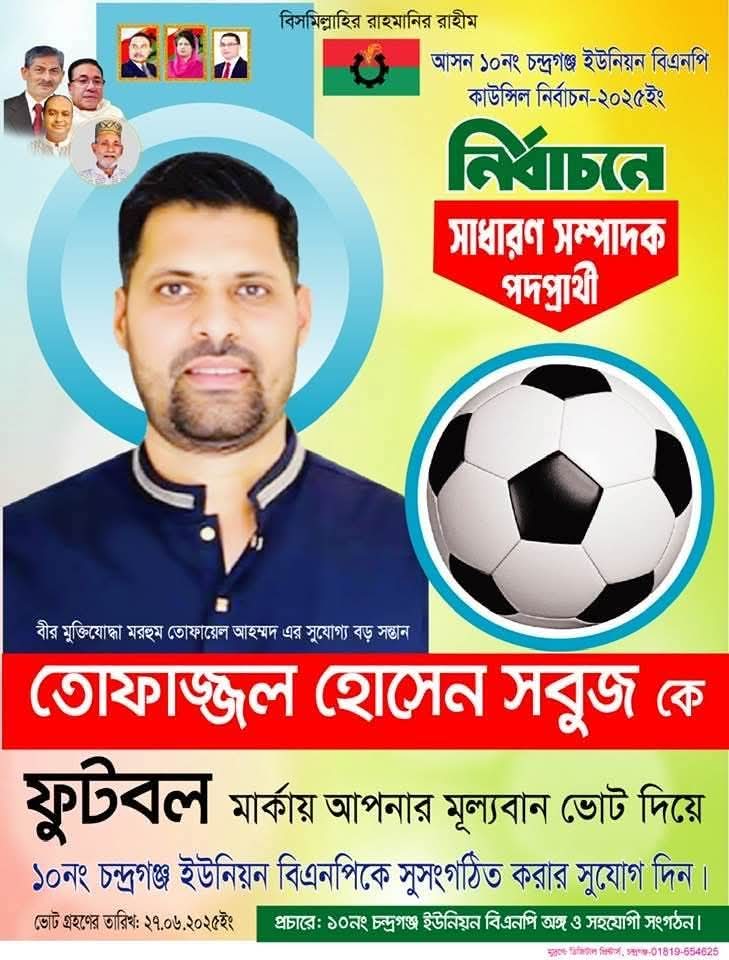 আগামী ২৭ জুন, শুক্রবার অনুষ্ঠিত হতে যাচ্ছে লক্ষ্মীপুর সদর উপজেলার চন্দ্রগঞ্জ থানার ১০নং চন্দ্রগঞ্জ ইউনিয়ন বিএনপির সম্মেলন ও কাউন্সিল। এই গুরুত্বপূর্ণ কাউন্সিলে সাধারণ সম্পাদক পদে প্রার্থী হিসেবে নির্বাচনে ফুটবল মার্কা প্রতিক নিয়ে প্রতিনিধিত্ব করছেন দলের দুঃসময়ের কান্ডারী মরহুম মুক্তিযোদ্ধা তোফায়েল আহমেদের বড় ছেলে অভিজ্ঞ,পরিশ্রমী ও পরীক্ষিত নেতা তোফাজ্জল হোসেন সবুজ।